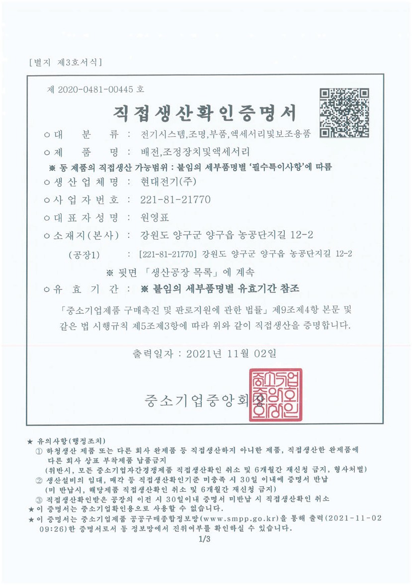 - 이전글직접생산확인증명서(옥내조명 및 설비) 23.05.01